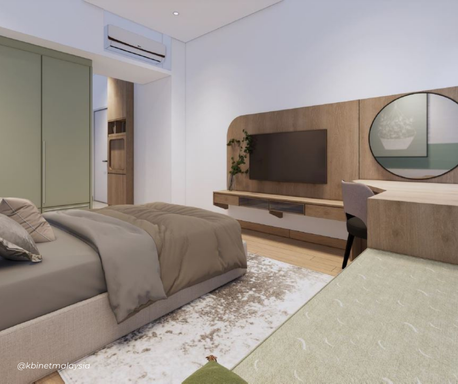 This Scandinavian minimalist bedroom, with its earthy tones, simple cabinets and furniture, and green and light brown props, provides a peaceful atmosphere to unwind.